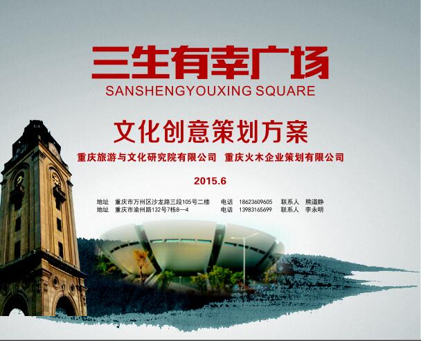 近日,由重庆旅游与文化研究院承担的《重庆万州三生有幸广场文化创意策划方案》完稿。本创意方案,本着“人文地标与城市形象同塑,文化挖掘与活化显化统筹,山水园林与文化小品互涵”原则,从三生有幸的传说故事中抽象提炼出若干文化元素,提出三生有幸广场的功能定位、园林绿化、文化小品、文化旅游创意,以确保实现万州区委区政府重点打造三生有幸广场的既定工作意图。